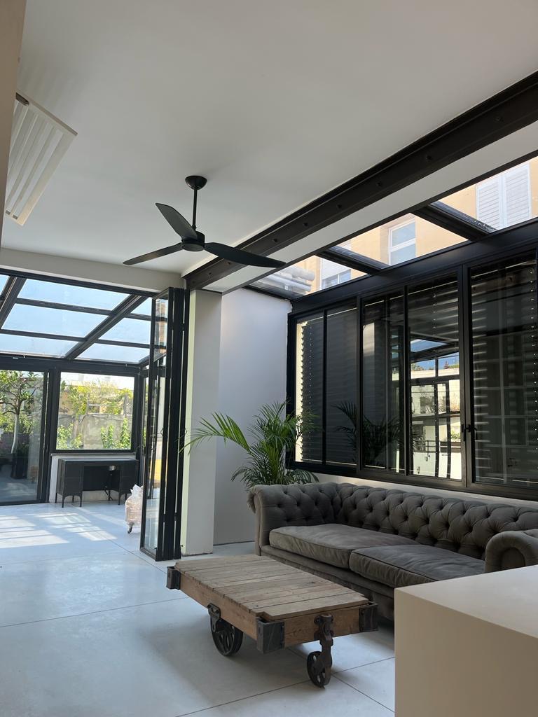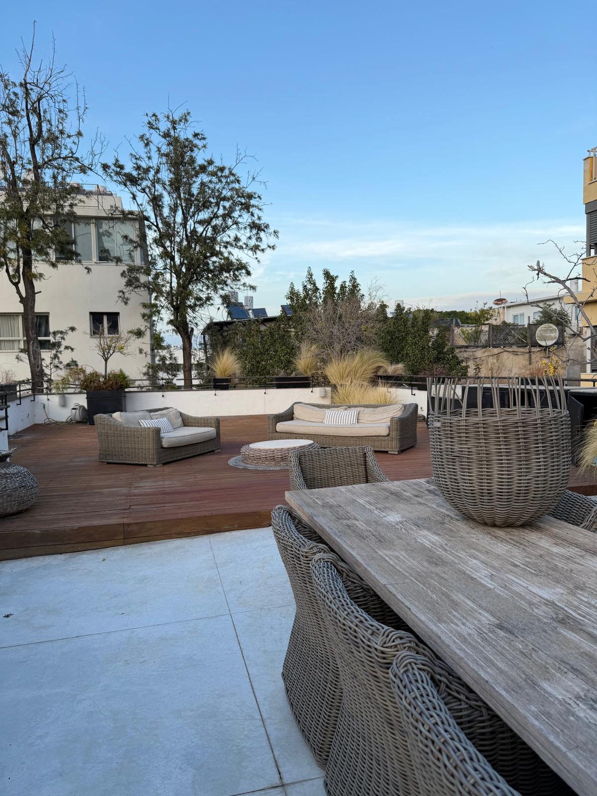Stunning architect-renovated penthouse for rent in the heart of Tel Aviv, located on Nachmani Street corner of Yavne in highly sought-after Lev Ha’ir.