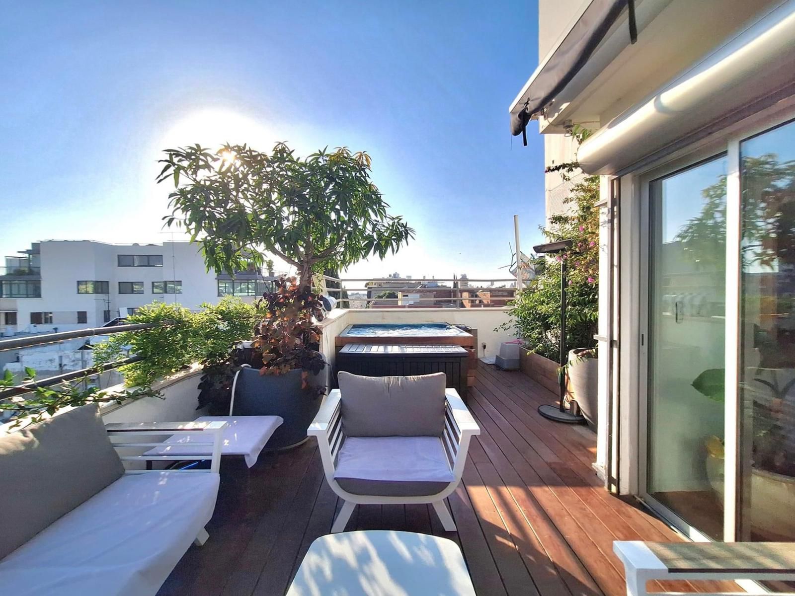 140 sqm built + 40 sqm roof terrace with a private jacuzzi and open views reaching the sea.